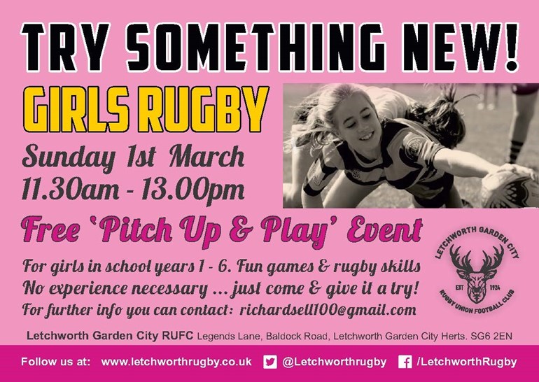 We are holding a free ‘Pitch Up & Play’ event on Sunday 1st March for girls in School Years 1 to 6 who want to come and give rugby a try. Just turn up at the club ready to start from 11.30am. Normal sports clothes & trainers will be fine - you can wear studded boots if you have them. There’ll be free food in the clubhouse after too! For more information please contact Richard e: richardsell100@gmail.com.